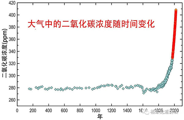 从上图中我们可以看到,在过去两千年的历史中,工业化革命以后的大气中的二氧化碳浓度的上升速率是非常快的,IPCC(联合国政府间气候变化专门委员会)的核心结论是:人类活动是当代气候变暖的主因。