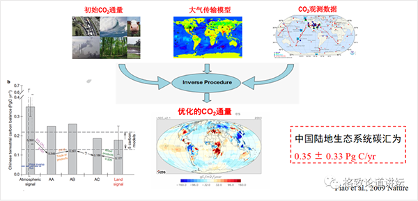 为了回答这一问题,我们有好几种方法,传统方法是跑到野外、挖个土去看一看这里面的碳储量到底有多少,现在也有一些新的高技术方法。中科院地理所的于贵瑞老师,他们是利用涡度相关的技术来估算生态系统碳汇,还有一些是基于卫星的数据估算,还有的方法是利用大气二氧化碳浓度的观测数据进行反演模型。我们在这个研究里边用了传统的地面观测和大气的反演模型的方法。