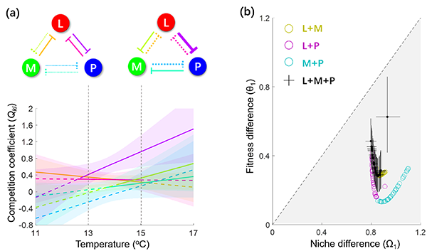 图2. (a)三种水蚤的种间竞争强度随温度的变化;(b)水蚤群落中物种间的生态位差异和适合度差异(灰色区域表示可共存的参数值)。