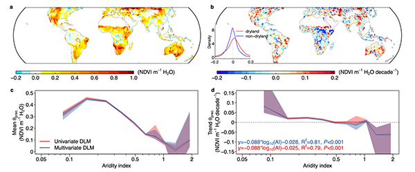 图1. 植被绿度对降水敏感性的平均大小(a, c)及其长期趋势(b, d)