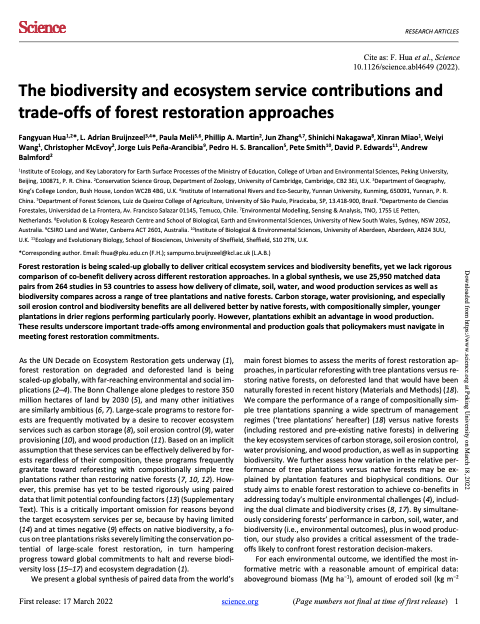2022年3月18日,北京大学生态研究中心华方圆研究员带领的保护生态学课题组牵头7个国家研究人员组成的跨学科团队,在Science以长文形式在线发表题为“The biodiversity and ecosystem service contributions and trade-offs of forest restoration approaches”的研究论文。研究汇总分析了来自全球53个国家地区、264个野外研究的近2.6万条数据,发现与结构简单的人工林相比,天然林可以更好地支持生物多样性保护和实现地表碳存储、土壤保持、水源涵养的生态系统服务,但是人工林在木材生产方面具有优势。伟德体育官网生态研究中心研究员华方圆博士为论文的第一作者和共同通讯作者,保护生态学课题组成员王玮亦和苗新然为论文的共同作者。研究得到北京大学生态研究中心学科建设人才启动经费、中科院战略性先导科技项目、英国皇家学会牛顿基金、巴西圣保罗基金的资助。