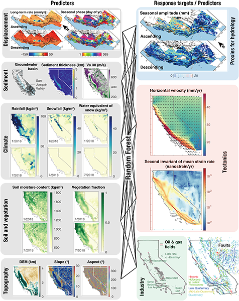 机器学习为探索非线性、非参数化的地球信号提供了一个经验型、学习型方案。研究针对跨太平洋板块与北美洲板块边界,通过多轨Sentinel-1遥感影像提取了美国加州的时空地表形变产品,并在机器学习的框架下集成构造应变、地势地貌、气象水文、地质岩性、能源开采等交叉科学数据集,系统的评估了地表形变源的时空特性和对估算具有重要贡献的因子,同时发现沿San Andreas断层分布的高应变条带与植被指数强相关。