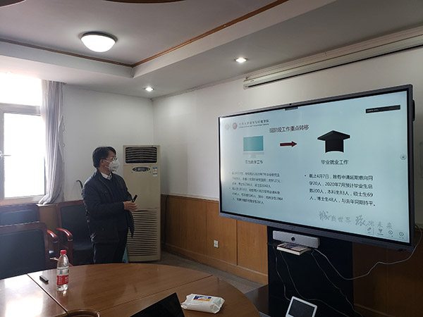 张新平介绍了学院2020届毕业生就业进展和未落实毕业去向同学情况报。学院自2月初以来开展多轮全覆盖毕业进展摸排,并协助学生及时办理毕业生就业推荐表、三方协议书申领等就业手续。针对受疫情影响未落实毕业去向同学开展了“敲门行动”,一对一、手把手定向推荐岗位,开展分行业、分领域求职指导,积极联系用人单位进行内部推荐。未来还将开展校友专场招聘活动,与研究生导师、校友多方联动帮扶就业困难同学。