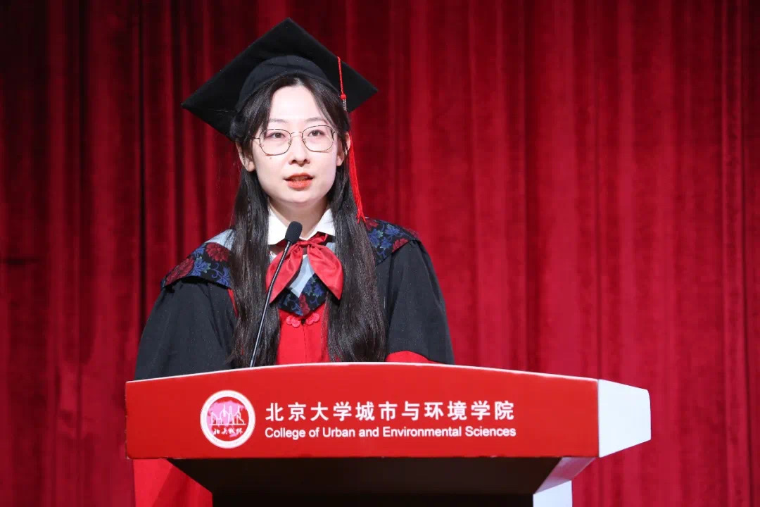 2017级博士研究生孟文君作为研究生毕业生代表发言。她分享了自己在北大、在伟德的九年光阴。她倡议我院研究生毕业生承载着北大教给我们的知识、伟德带给我们的历练,在未来的道路上发扬北大人的精神,一路向前。