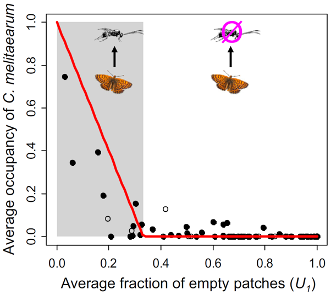 图2. 芬兰Aland群岛上寄生蜂(Cotesia melitaearum)的斑块占有比例与宿主蝴蝶的空缺比例的关系。黑色点表示观测数据,红色线表示理论预测。