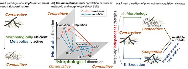 图 (a)单一维度细根经济学谱假说 (b)本研究发现的多维细根经济学谱 (c)基于多维经济学谱(multi-dimensional root economics spectrum)提出的植物获取土壤养分策略的新理论框架(植物通过投资细根分泌物的激发效应去活化养分与通过构造形态上高效率的细根去吸收养分可能是独立互补的)